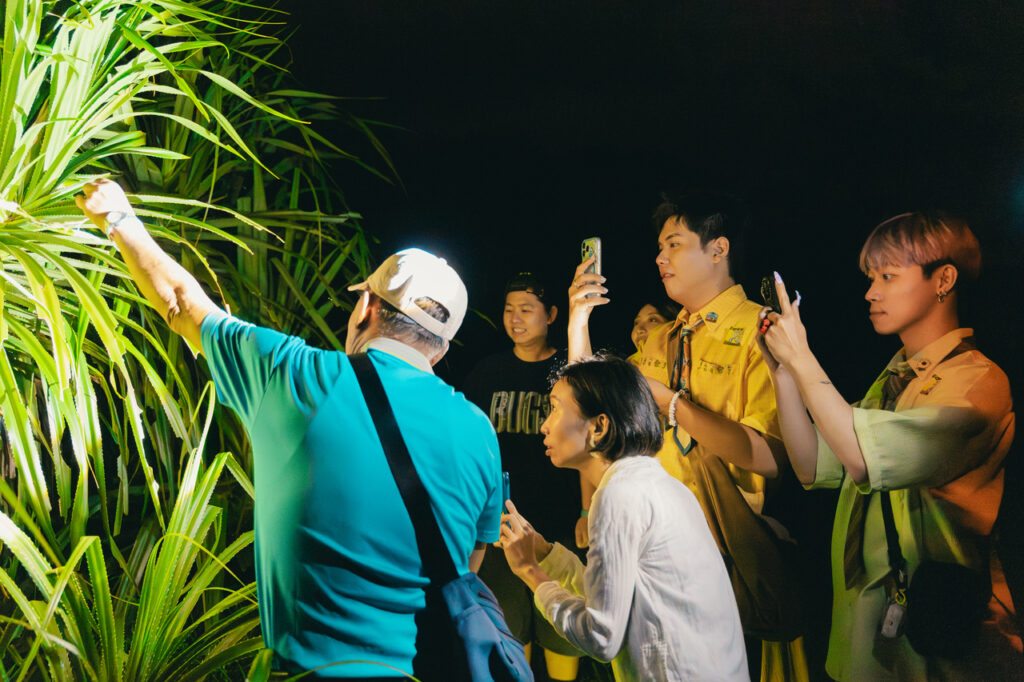 第一晚的探索,從夜裡的森林展開。我們深入墾丁社頂公園——沒有人造光,也沒有喧囂的人潮。由資深導覽老師帶路:吹晚風、聽蛙鳴,尋找梅花鹿的蹤跡。幸運的我們,趕上雨後毛毛蟲羽化的時節,遇見黃裳鳳蝶與黑點大白斑初展翅的畫面。這堂久違的森林生態課,讓人扎實感受到最自然且真實的南國節奏。