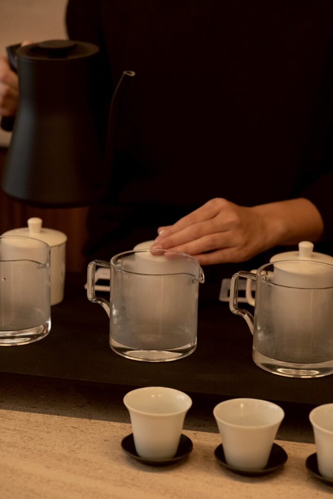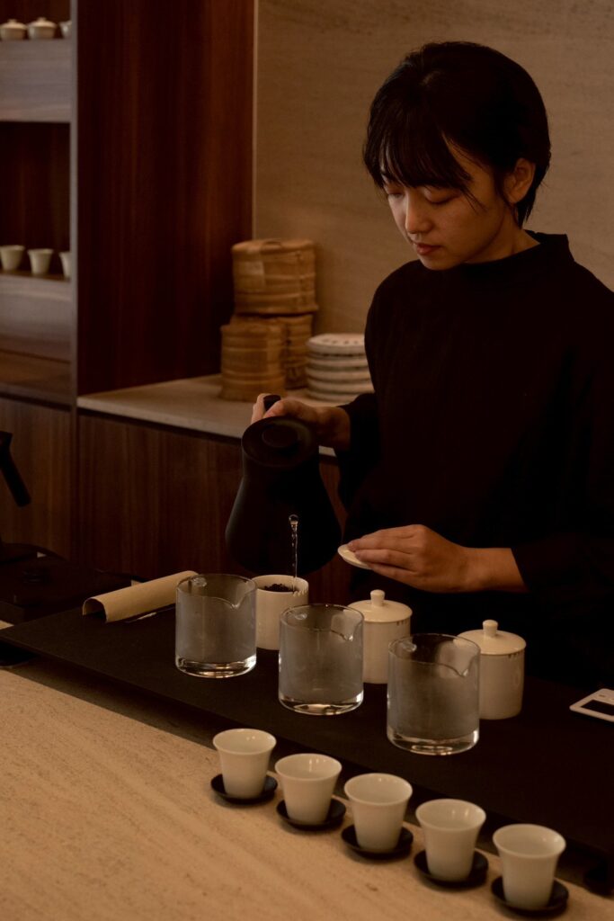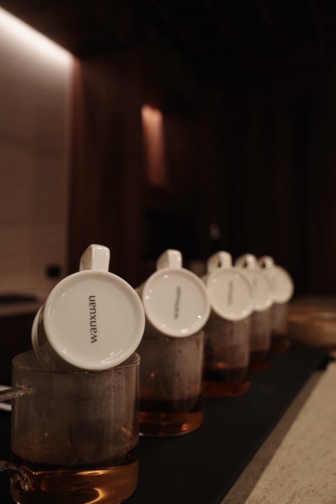 萬軒茶室重視每一泡茶的呈現與飲用方式:東方美人茶與台灣風味茶採用比賽茶標準的鑑定杯沖泡,搭配翻口小杯,還原風味本質,同時保留香氣層次,讓茶在冷卻過程中展現更豐富的變化;古樹普洱茶則提供陶杯與蓋碗飲用,使用圓口杯可提升整體口感滑順度,並展現其耐泡與轉化的魅力。