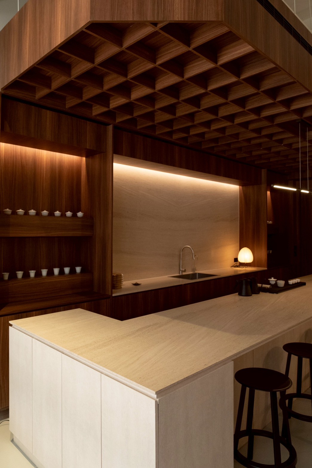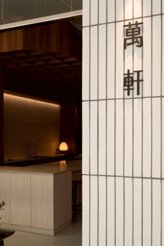 「萬軒茶室」空間由 OH DEAR studio 操刀,選用胡桃木、洞石與長形磁磚三種材質,構築出沉靜而富自然氣息的茶室場域。設計上強調材質手感、動線流動與光線進入的節奏,呼應茶文化中的留白與呼吸感,使品茶不只是感官體驗,更是一種日常沈澱與對話的方式。