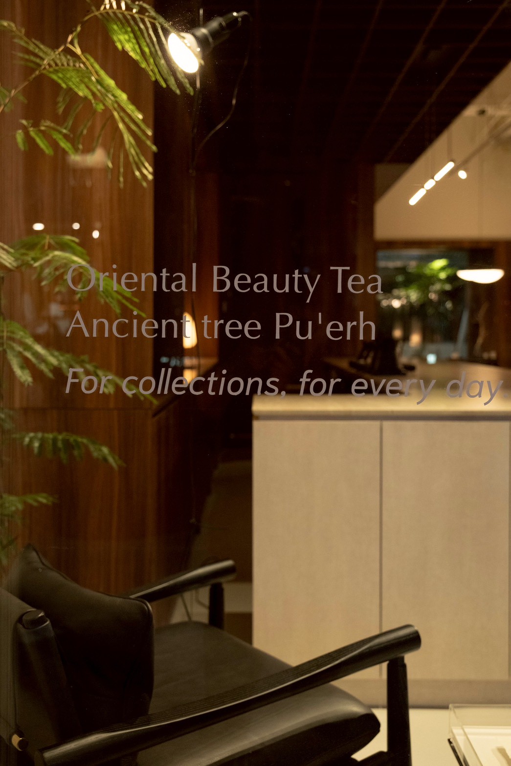木櫃展區靈感來自東方屏風意象,轉化為斜面幾何語彙,營造出行走與停留之間的韻律與詩意。大面落地窗則化作「畫框」焦點,將窗外綠意納入視野,隨日照灑落、自然光穿透,形塑靜中有動、內外交融的安靜片刻。整體空間搭配線條輕盈的現代傢俱,揉合古典與當代氣息,同時象徵侍茶師溫和而靈動的氣質。