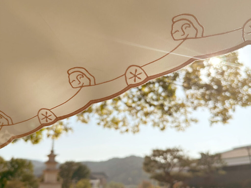 「人面紋圓瓦當」延續原本安置於屋簷末端的裝飾瓦,不僅能阻擋雨水的功能,更有驅邪避凶寓意、祈求好運。MU:DS將這個寓意與原有功能以現代方式轉化,開發出晴雨兩用傘。設計上將原本單一的圖樣做延伸,使其裝飾整圈傘緣,增添趣味與美感。從染色、刺繡到縫製,均為韓國製造,傘身輕巧、可輕鬆放入包中,攜帶與收納都十分方便。