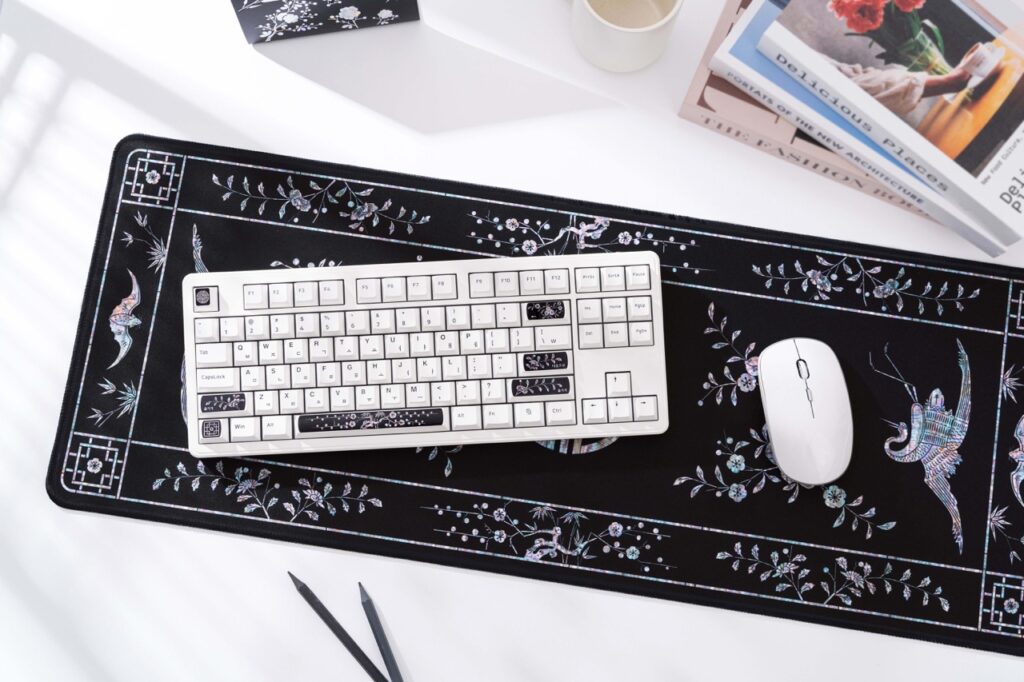 將螺鈿盒上的傳統螺鈿紋樣與天然貝殼的質感應用在滑鼠墊上,打造出兼具美觀與實用的辦公桌裝飾。上面的鶴與桃紋象徵長壽與吉祥,既增添氣勢,又帶來美好寓意。