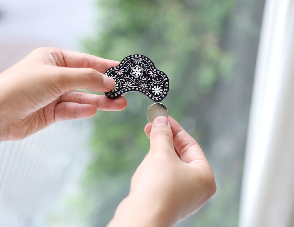 這是一款以「螺鈿菊花唐草文盒」的盒子形狀與華麗紋樣為靈感製作的磁鐵兼胸針。上面的三朵花紋以天然貝殼呈現,增添細緻閃耀的光澤,其餘傳統紋樣則採用UV印刷製成。可吸附於冰箱、玄關門等鐵製表面,作為居家裝飾小物;背面另附一顆磁鐵,也可夾在衣物之間作為胸針使用。