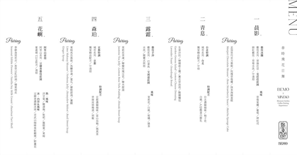 此次「春時飛花日舞」Blossom Geisha Coffee Pairing Experience,以藝伎咖啡(Geisha/ Gesha Coffee)為風味主軸, BEMO 團隊精選來自台灣阿里山及巴拿馬等高海拔產區的競賽等級藝伎豆款,透過多重式萃取方式與精準溫度曲線,完美展現藝伎咖啡細膩、透明而富層次的風味輪廓。加藤峰子則以「春日香氣的魔法」為發想,以日本里山地景、花卉與草本植物為創作靈感,透過當代素食甜點語彙挑戰既有框架,擅用香草植物,以味覺輕柔、嗅覺層次以及視覺留白的節奏,展現技法與哲學的突破,讓咖啡與甜點彼此呼應,交織出春日盎然風景。