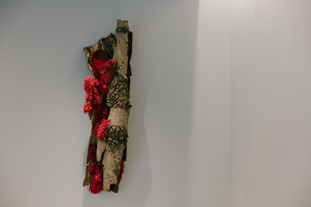 空間擺設由LANDHILLS植物藝術家廖浩哲創作,使用台灣民間信仰中常見的「紅色香腳」與「紅繩」,封存在如同凝膠般的異材質中,形成一種張力十足的視覺對話。