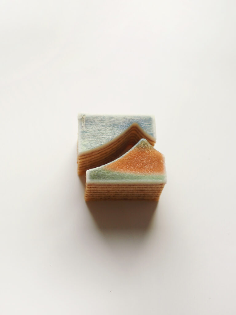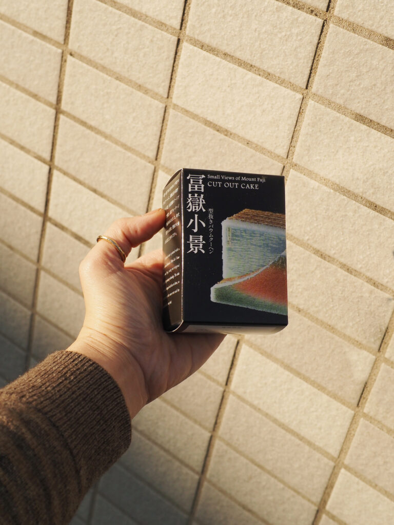 有別於過往的可愛圖像,這款年輪蛋糕以浮世繪畫家葛飾北齋的作品《冨嶽三十六景》為靈感設計,將富士山與天空分離,撥開後更顯立體感,讓畫作又有不同的詮釋方式。蛋糕約手掌大小,且可常溫保存。內餡混入碎杏仁粒,口感更加豐富。富士山作為日本象徵,作為伴手禮也能留下深刻印象。